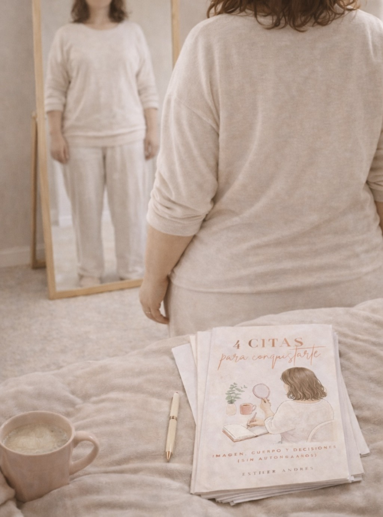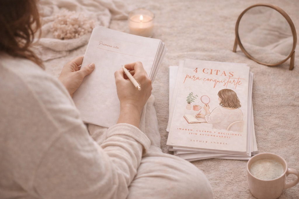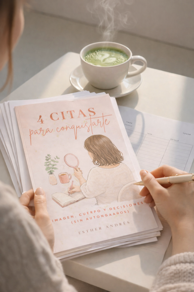 Dentro de ese espacio nace el workbook 4 citas para conquistarte. No pretende enseñarte nada nuevo ni decirte quién deberías ser. Es una herramienta para sentarte contigo, mirarte con honestidad y empezar a elegirte desde un lugar que puedas sostener en el tiempo.